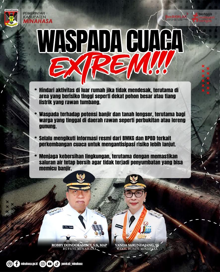 Hal ini disampaikan Bupati Minahasa Robby Dondokambey dan Wakil Bupati Vanda Sarundajang (RD-Vasung) mengingatkan dampak cuaca ekstrem yang dapat terjadi diwilayah Kabupaten Minahasa.