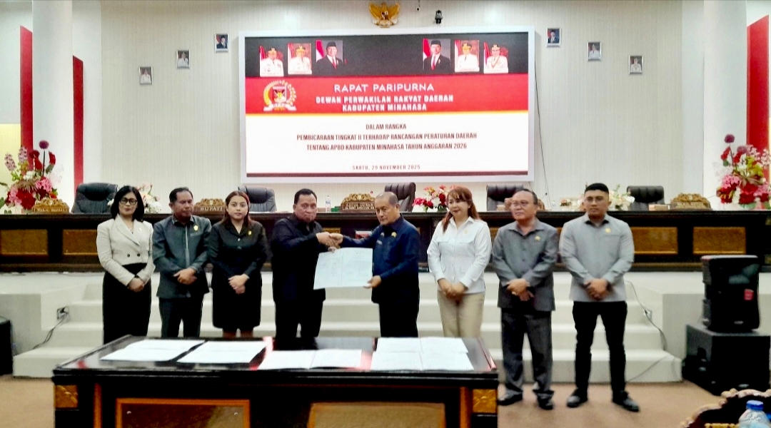Setelah mendengarkan pendapat akhir fraksi, naskah keputusan bersama Ranperda APBD 2026 ditandatangani oleh Bupati Minahasa, Robby Dondokambey SSi MAP, dan Pimpinan DPRD.